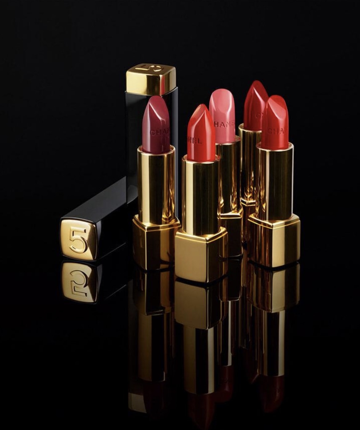 Pour les fêtes de fin d’année, CHANEL réinvente son rouge à lèvres Rouge Allure avec 5 nouvelles teintes. L’étui est embossé du chiffre 5 dans un packaging noir et doré.