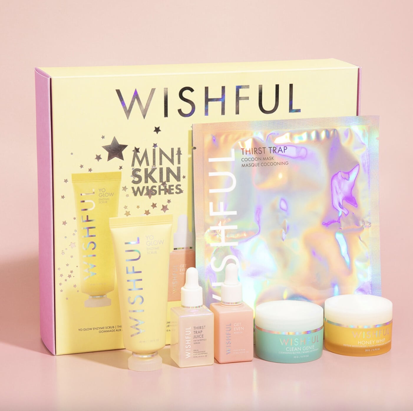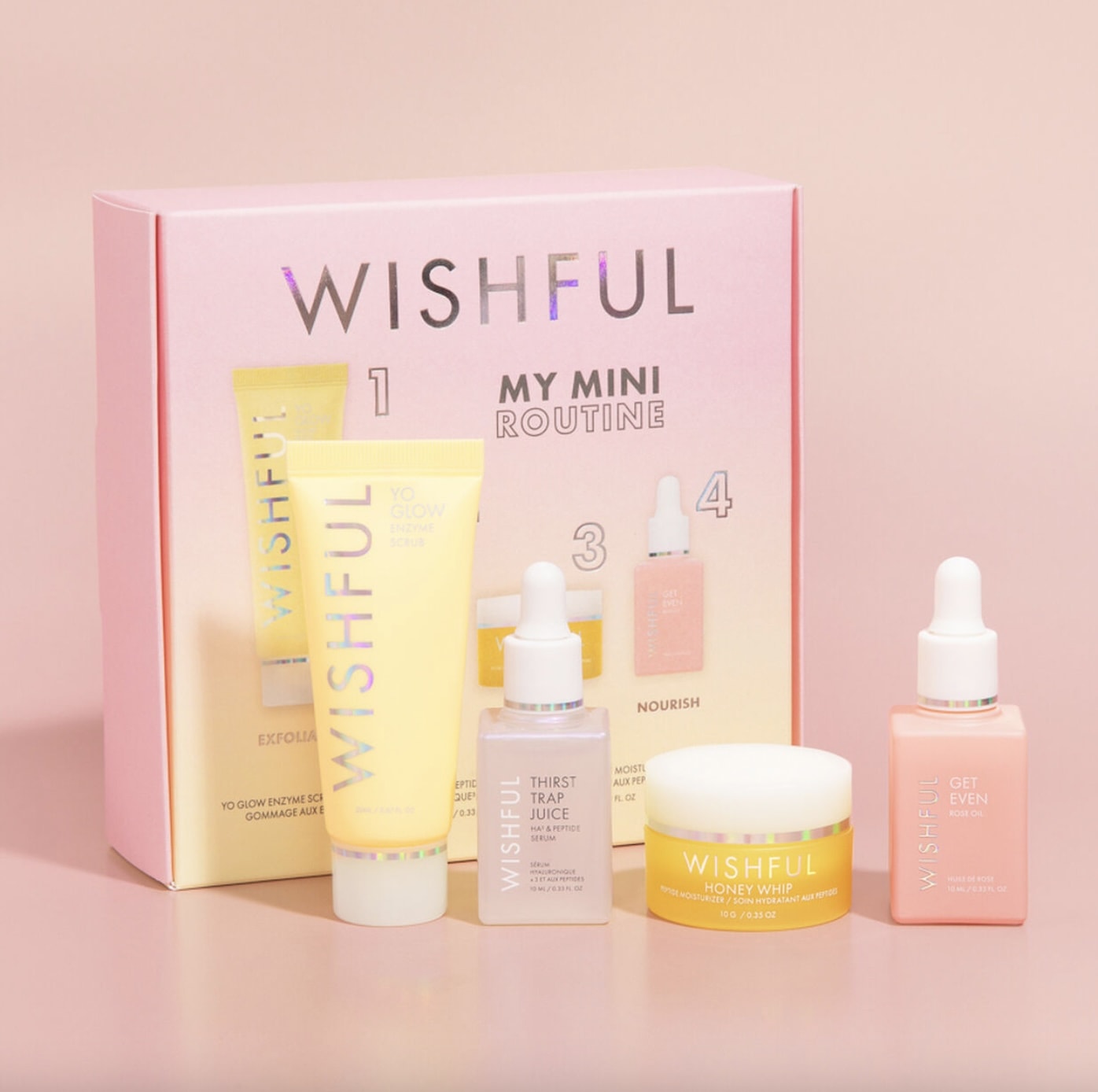 Passons maintenant aux coffrets de Noël 2021 d’Huda Beauty avec ce premier kit de sa seconde marque Wishful. C’est un ensemble de best seller de la marque en format mini pour votre routine soin.
