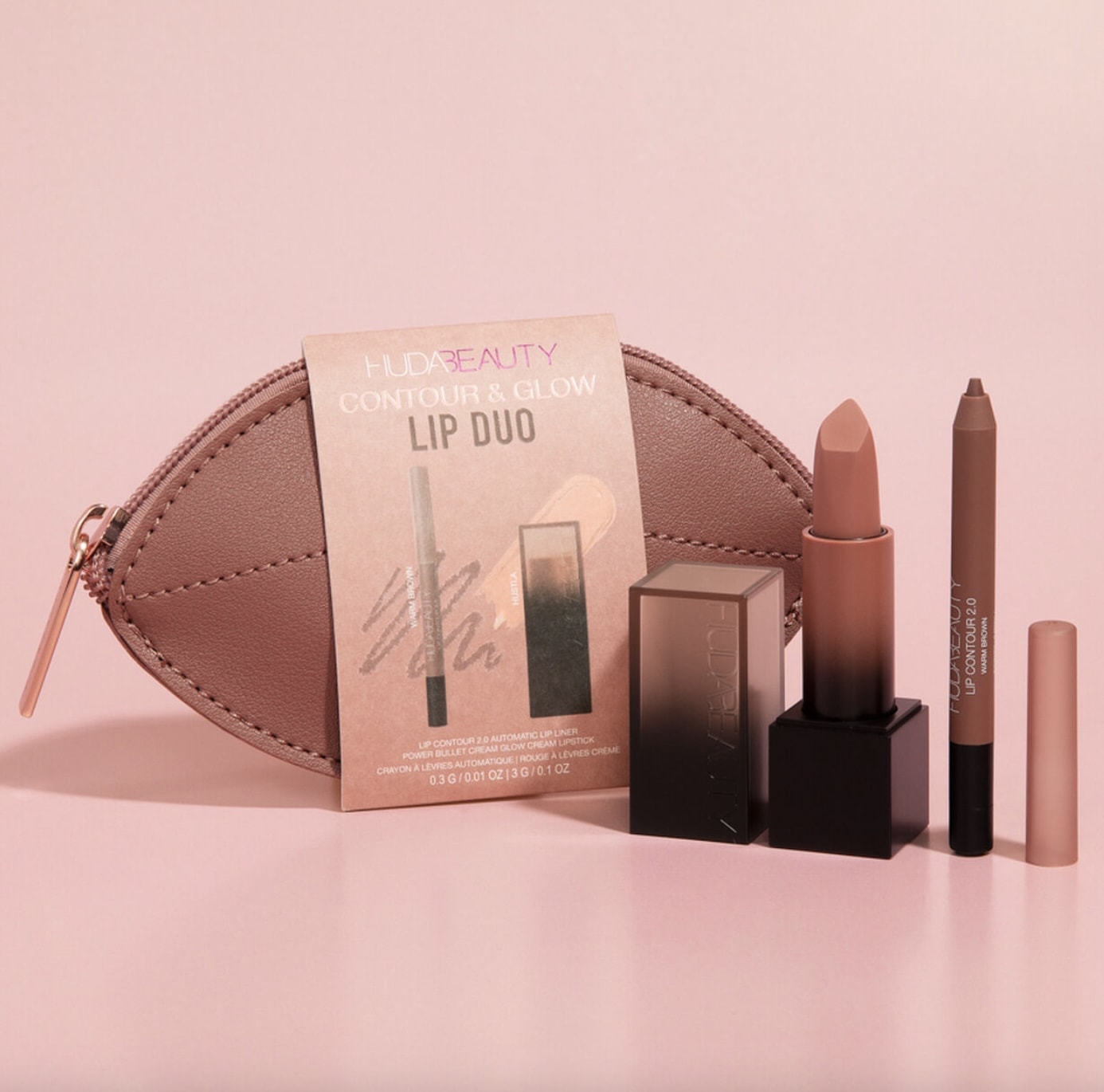 Passons aux coffrets make-up avec le Contour & Glow Lip Duo qui reprend la forme des lèvres emblématiques d’Huda Beauty.
