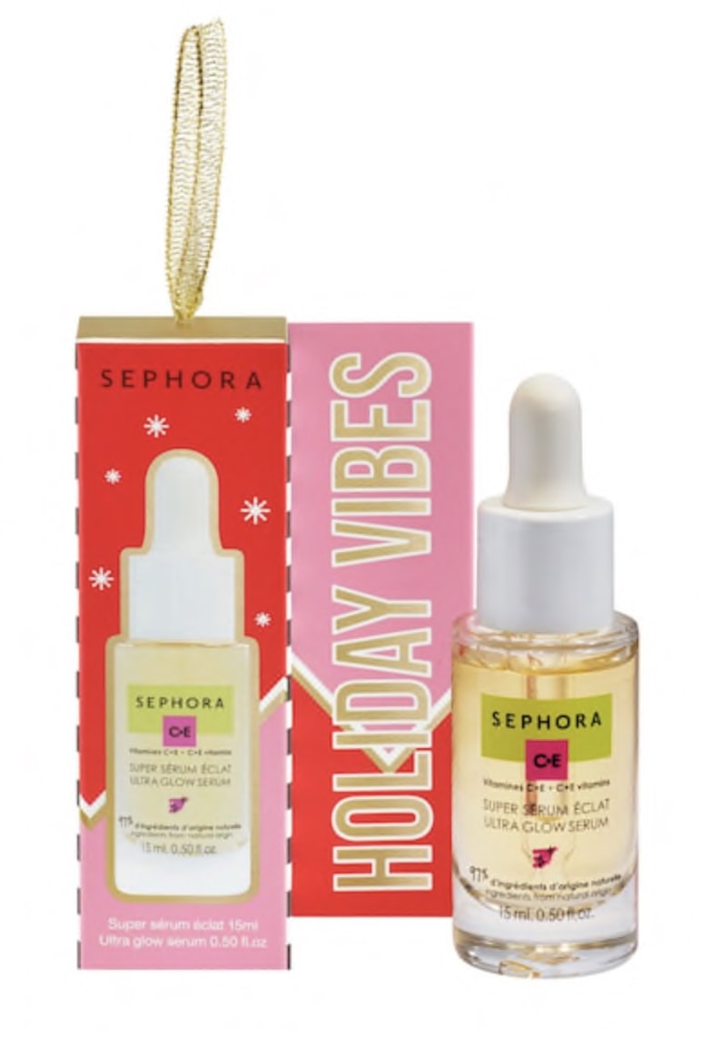 Le Super Sérum Eclat revient en ornement pour votre sapin en mini format (15 ml) pour l’emporter partout.