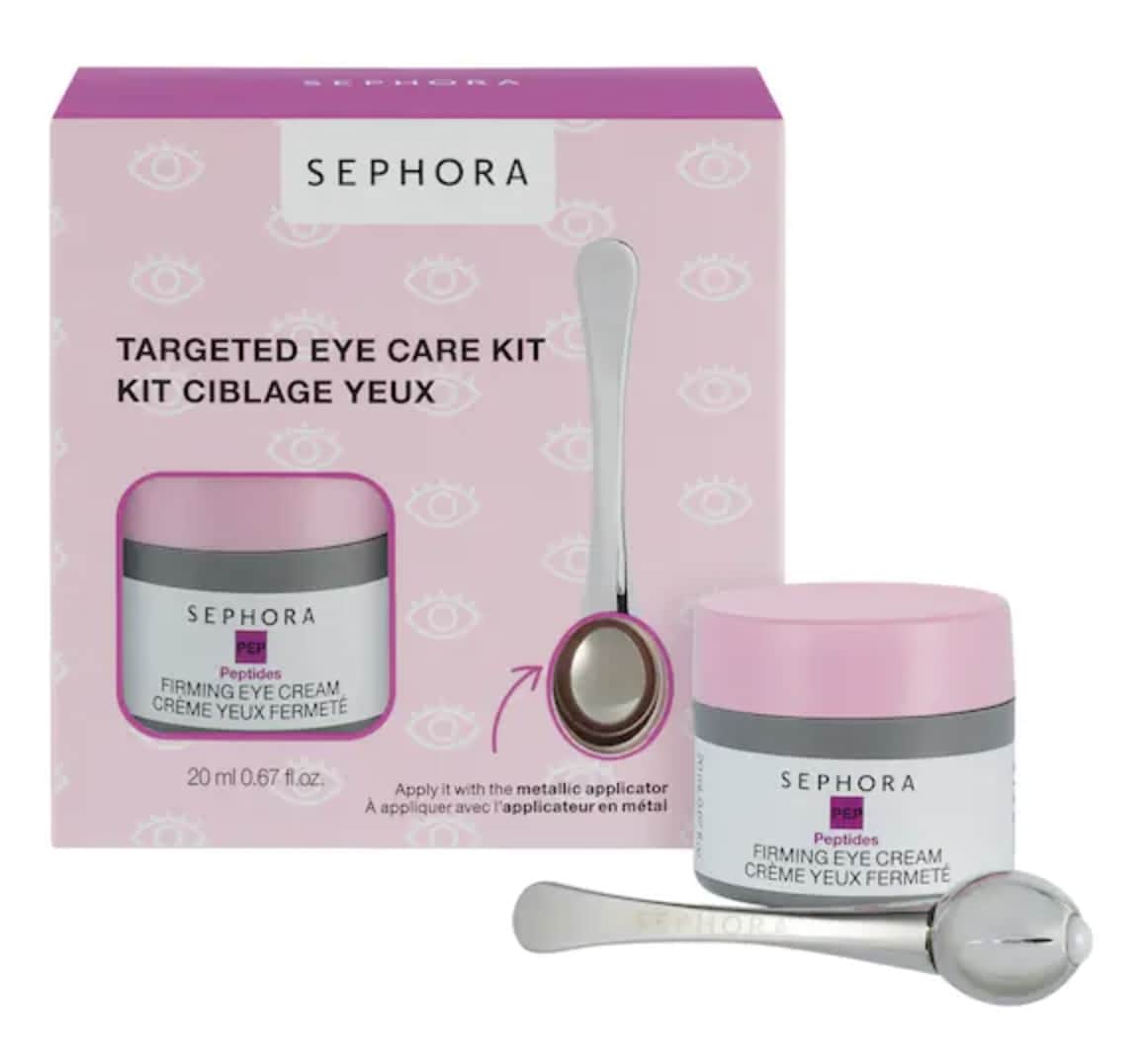 Sephora propose un nouveau kit composé d’une crème yeux fermeté et d’un applicateur en métal. L’applicateur donne un effet froid sous le contour des yeux, parfait pour défroisser le regard et diminuer les poches.