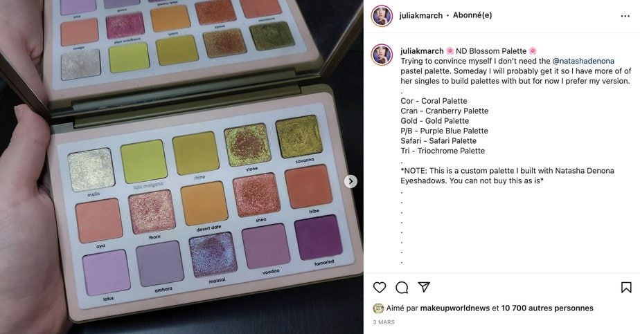 Je suis tombée il y a peu sur l’influenceuse instagram « juliakmarch » qui publie divers contenus beauté comme des swatches, des make-up et des remix pour créer les palettes de ses rêves.