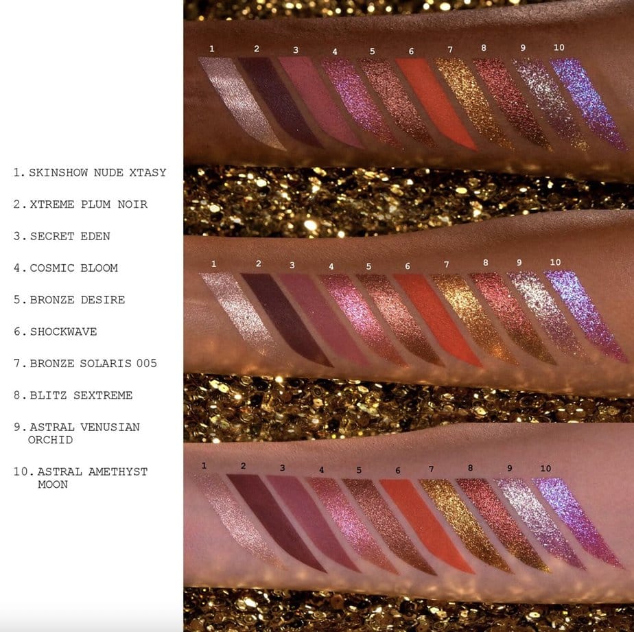 La palette est composée de teintes mattes, irisées et métallisées avec deux duo-chromes et un trio-chrome.