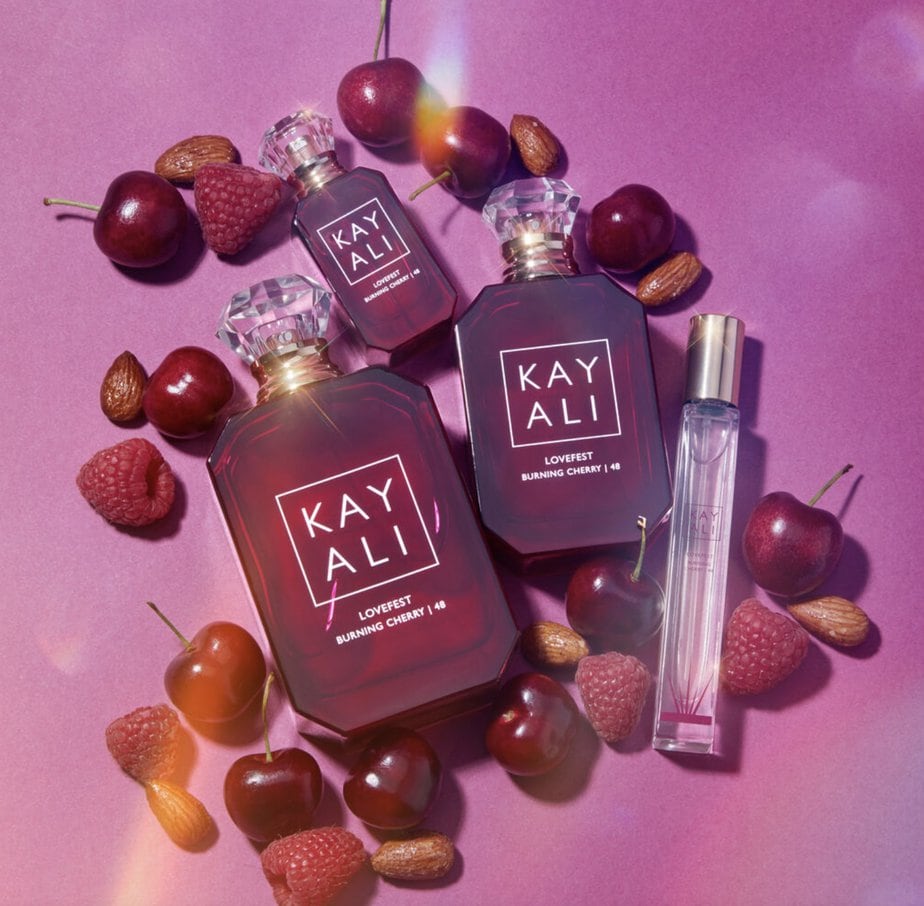 Nouveau parfum de Kayali, le Lovefest Burning Cherry célèbre l’amour avec des notes gourmandes et boisées. De la praline caramélisée mariée à la framboise et la cerise, ce parfum sera votre allié avec ses notes réconfortante cet automne.