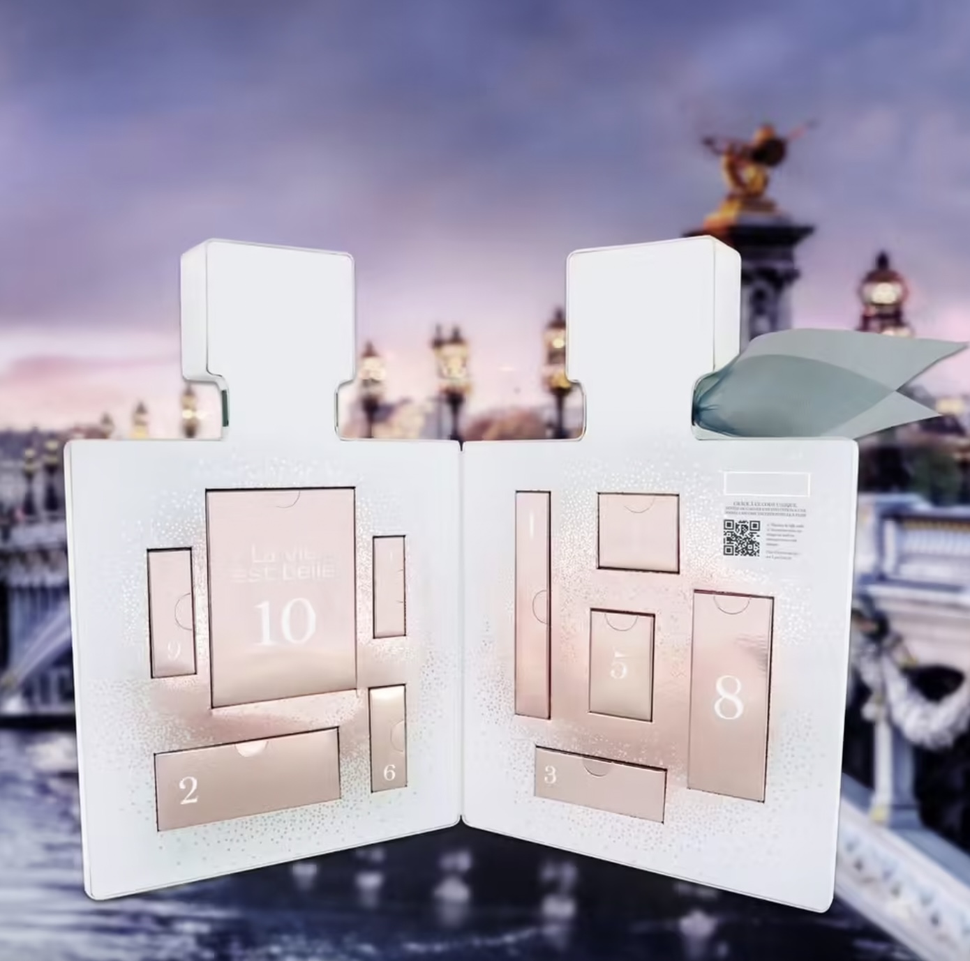 Cette année, nous avons également le droit à un coffret / calendrier de 10 cases réservé au parfum La Vie Est Belle.