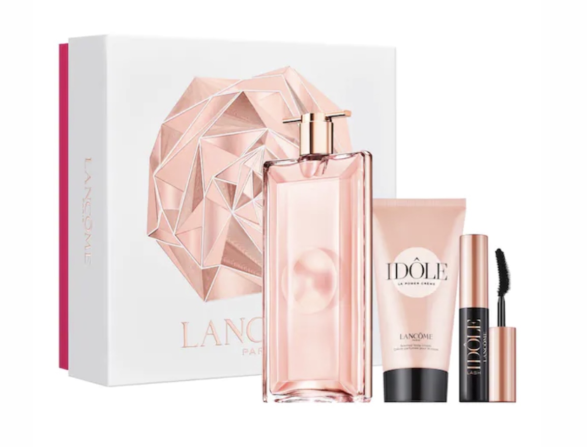 L’un des derniers parfums de Lancôme, Idôle avec ses notes de rose, jasmin et chypre est présenté dans ce coffret avec une crème corporel et un mascara de la même gamme.