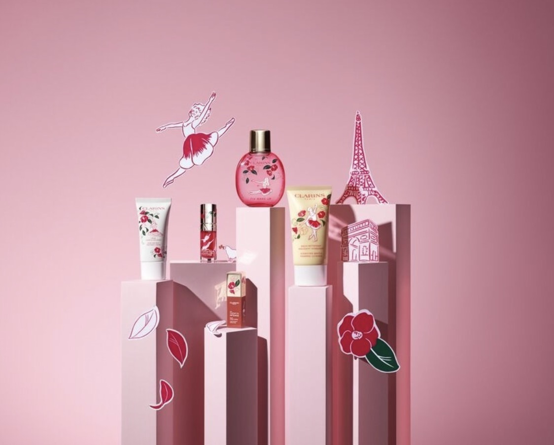 Clarins présente sa collection printemps 2023 inspirée du Camélia rouge, symbole de passion et d’amour. Une petite collection printanière illustrée par Kaori Watanabe représentant une ballerine à Paris revêtue d’un Camélia.