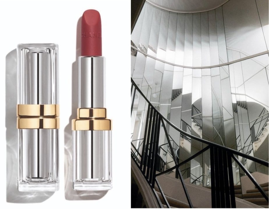 Le nouveau rouge à lèvres « 31 Le Rouge » de Chanel est présenté dans un luxueux étui de verre qui rappelle le mur de miroirs du célèbre escalier en colimaçon du 31 rue Cambon.