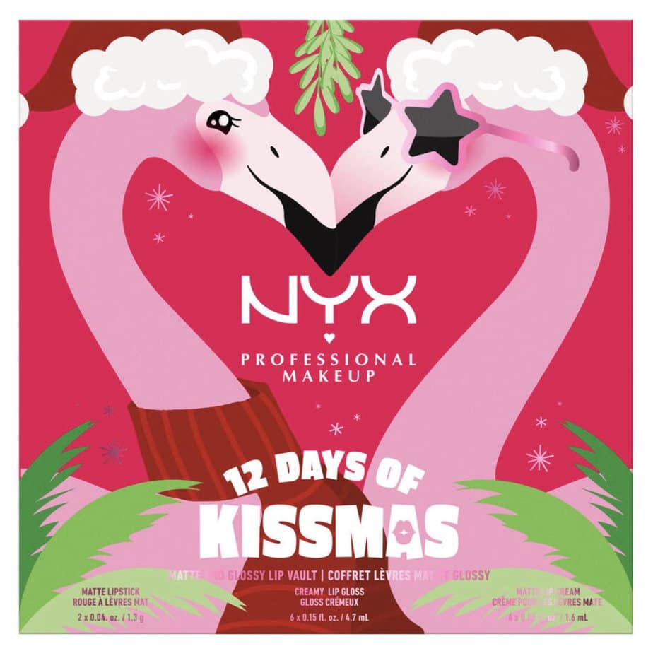 Sous la couronne de Noël ornée de flamants roses de NYX se cache un coffret de 14 « Butter Gloss » en édition limitée.