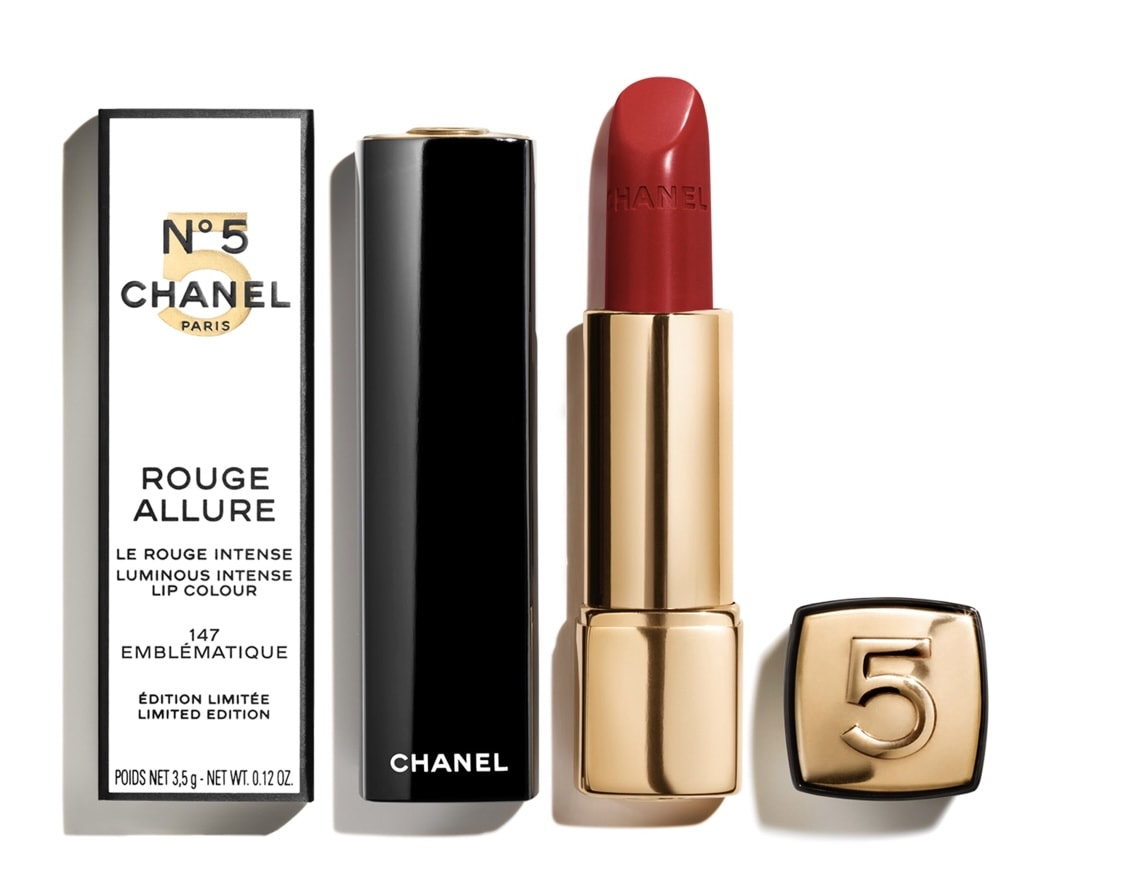Pour les fêtes de fin d’année, CHANEL réinvente son rouge à lèvres Rouge Allure avec 5 nouvelles teintes. L’étui est embossé du chiffre 5 dans un packaging noir et doré.