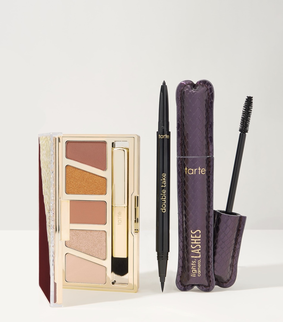 Créez un look de fête avec 3 indispensables Tarte avec un mascara Tartelette, le mascara Maneater et un eye liner double embout Double Take.