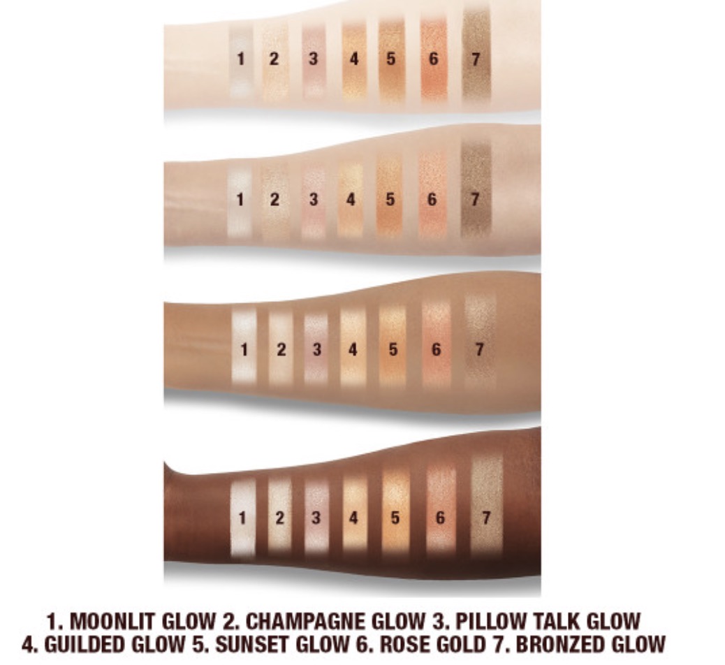 Charlotte Tilbury propose son nouvel highlighter avec 7 nuances avec un blanc, rose, champagne, or, cuivre doré et même bronze, ce qui est parfait pour trouver votre teinte idéale suivant votre carnation.