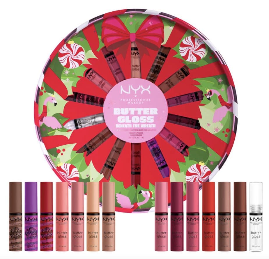 Sous la couronne de Noël ornée de flamants roses de NYX se cache un coffret de 14 « Butter Gloss » en édition limitée.
