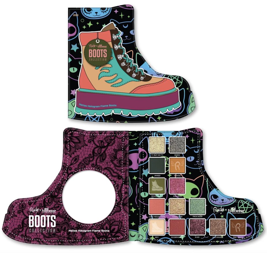 Composée de 14 fards à paupières aux tons automnaux dans les finis mats et lumineux, retrouvez la palette « Helios Hologram Flame Boots » de Rude en collaboration avec « Footwear Boots ».