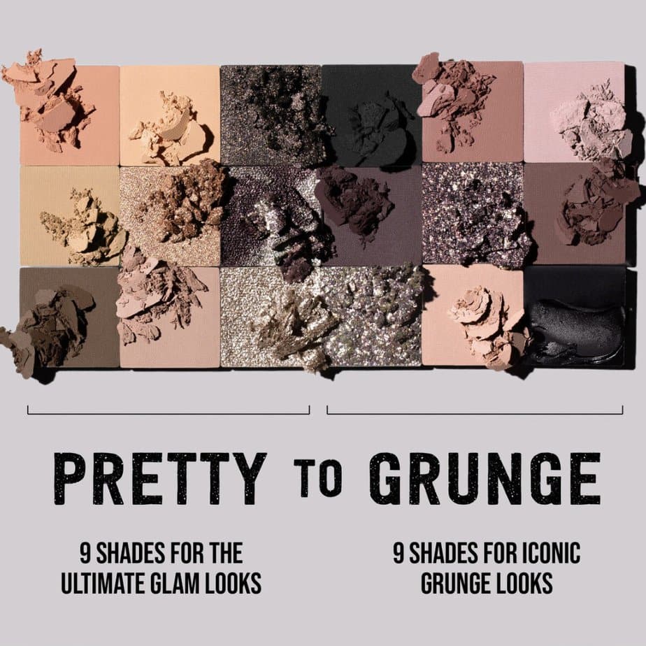 Vous ne savez pas par où commencer ? Les fards de la palette sont classés avec pour les neuf fards à droite des tons rosés et sombres avec une majorité de mat qui représentent le côté grunge et pour les neuf fards restants à gauche le côté glamour dans les tons neutres et champagne.